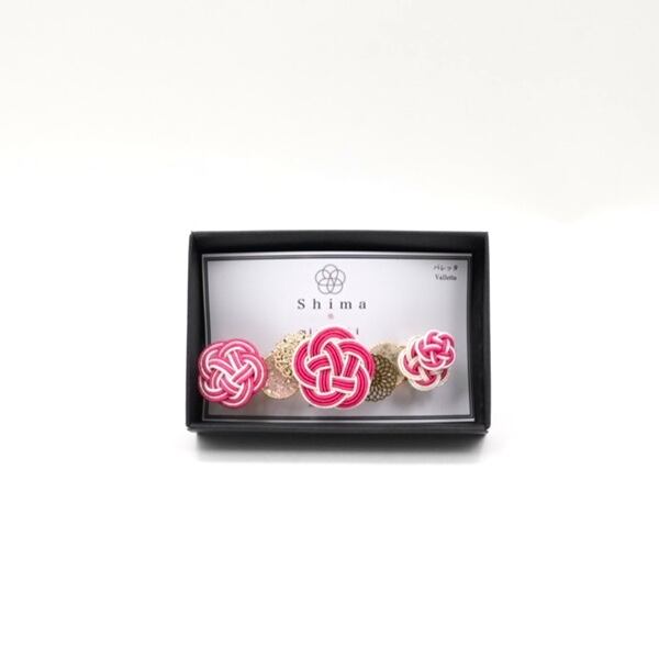 5本結び、4本結び、3本結びで組まれたサイズ違いの梅結びが華やかなバレッタです。