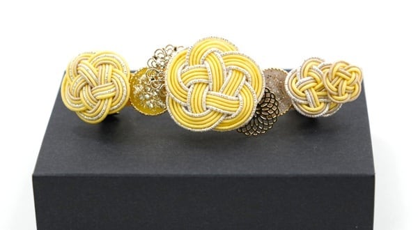 5本結び、4本結び、3本結びで組まれたサイズ違いの梅結びが華やかなバレッタです。