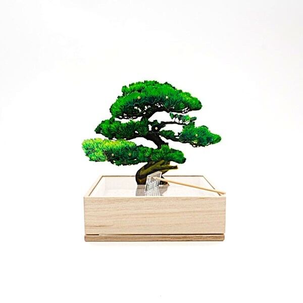 パッケージ兼土台となる木箱に、付属の白砂を敷き詰め、付属のレーキで水の流れを描き枯山水としてもお楽しみいただけます。