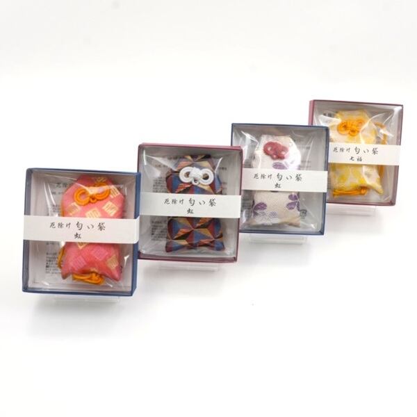 ポスト投函対応可能 伝統的な日本文化の一つ、匂い袋です。 白檀、ホワイトセージ、バロサント、乳香、レモングラス等を調合した晴れやかな香り。 衣装箪笥に入れたり、お車や鞄につけてお使いください。 ※匂い袋、紙箱の色柄はアソートになります。 ◎サイズ 外装:約83×92×27㎜