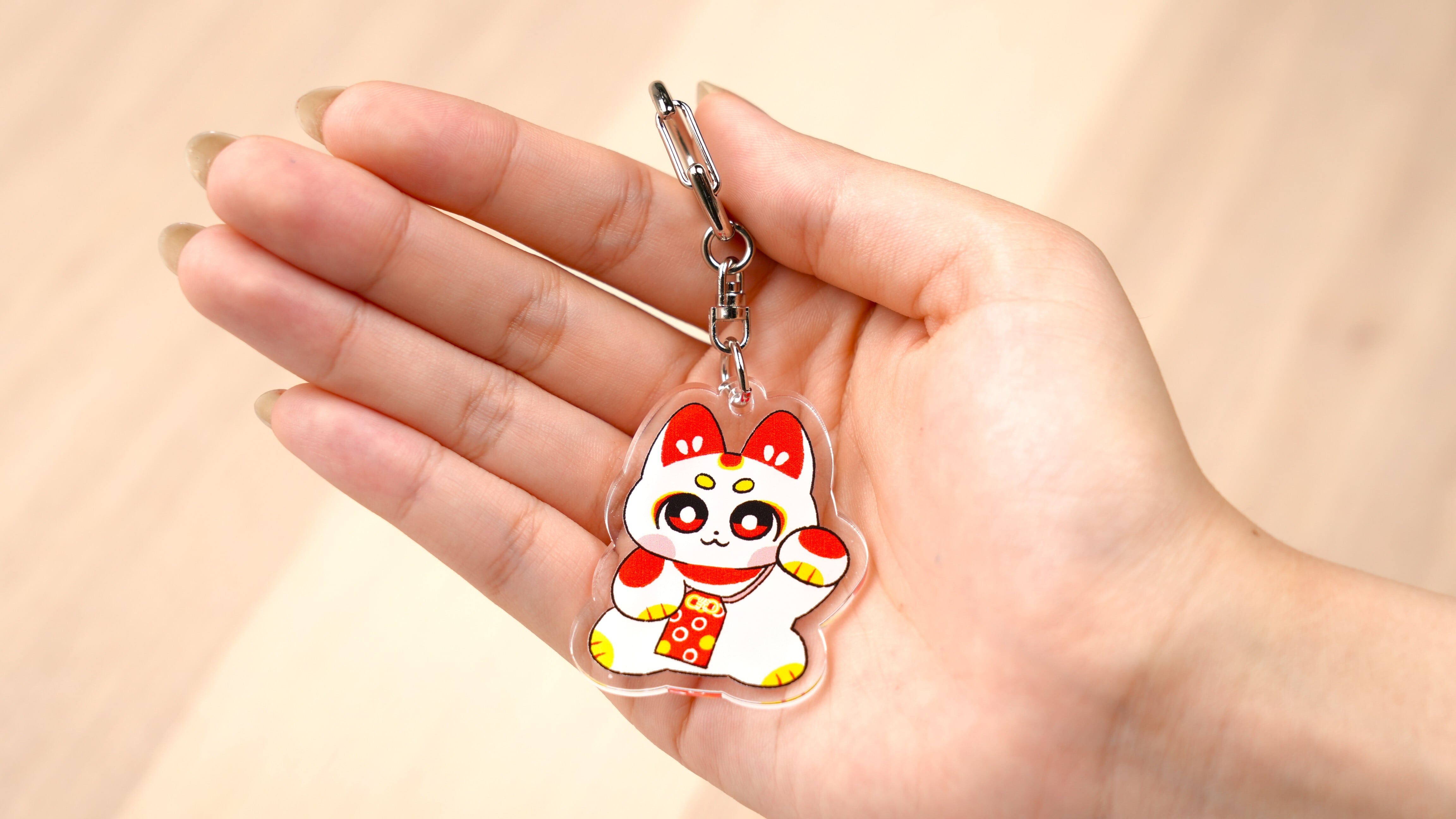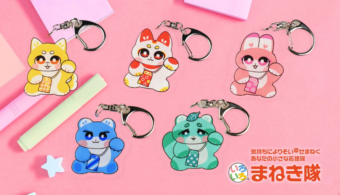 ポスト投函対応可 今日の気分はどんな色? 気持ちによりそい幸せをまねく、あなたの小さな応援隊『いろいろまねき隊』 いろいろまねき隊が手のひらサイズのキーホルダーになって登場! いろいろまねき隊は全部で5匹! お気に入りのキャラクターを見つけてね。 ◎本体サイズ 5×5㎝以内 ◎素材 アクリル ◎本体サイズ 5×5㎝以内 ◎素材 アクリル