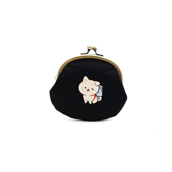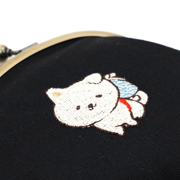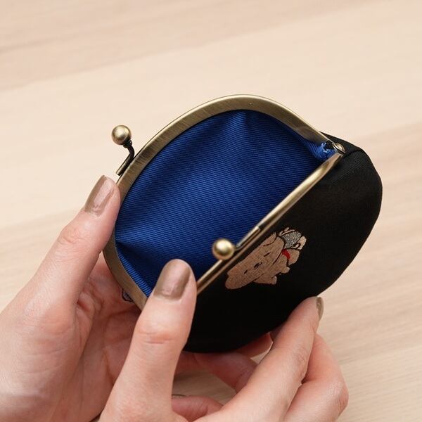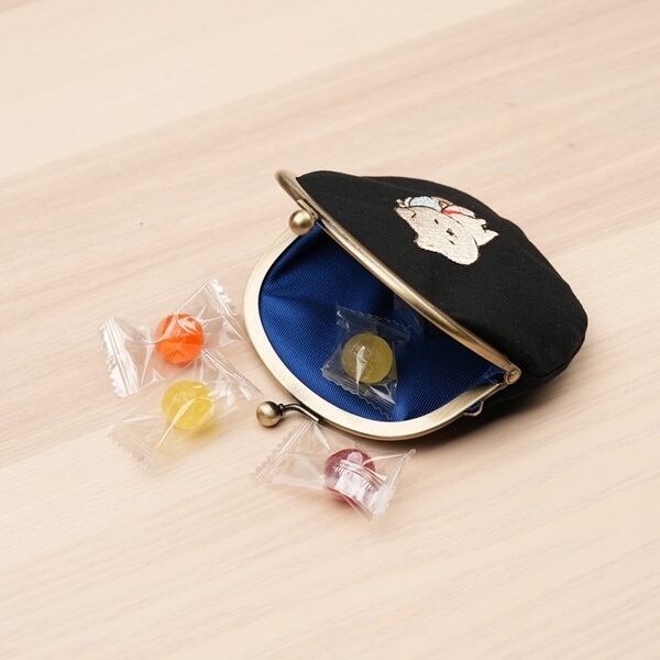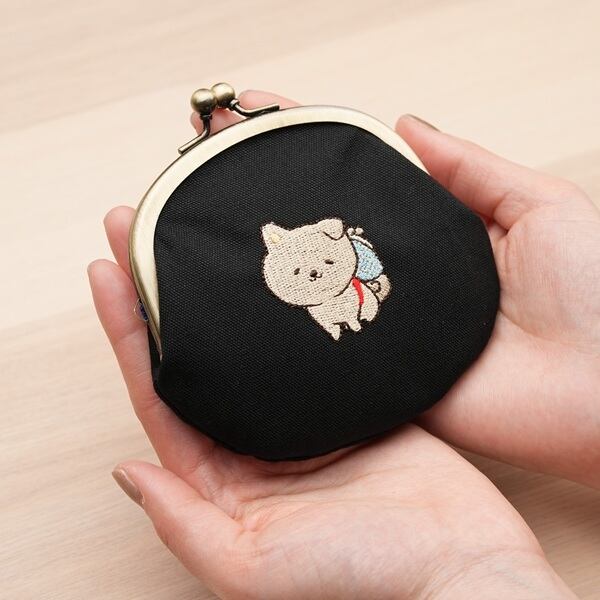 がま口の中央にちょこんとお座りをしたゆい吉が刺繍されていてとってもキュート!